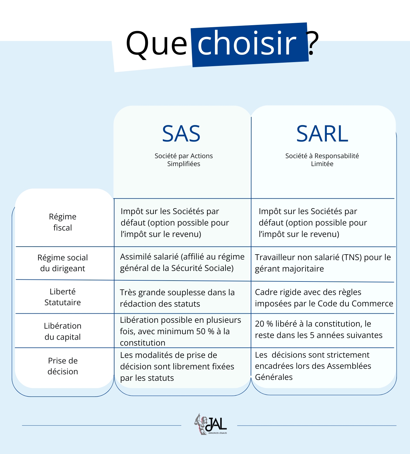 Voici un comparatif SARL/SAS issue du « Journal d’annonces légales ».