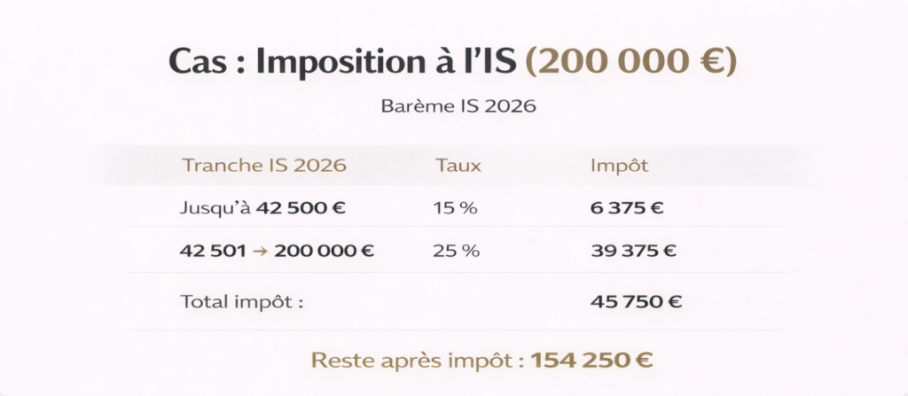 La société est imposée sur son résultat imposable (= chiffre d’affaires – charges déductibles) à un taux de 15 % jusqu’à 42 500 €, puis de 25 % au‑delà.